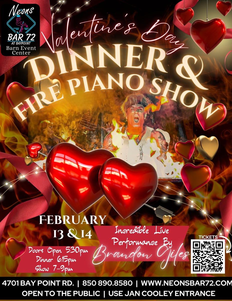 Ignite your Valentine’s celebration with an electrifying evening of dinner and live entertainment featuring Brandon Giles’ unforgettable Fire Piano Show. Treat your special someone to a romantic night filled with great food, a warm atmosphere, and a high-energy performance that blends passion, talent, and showmanship.