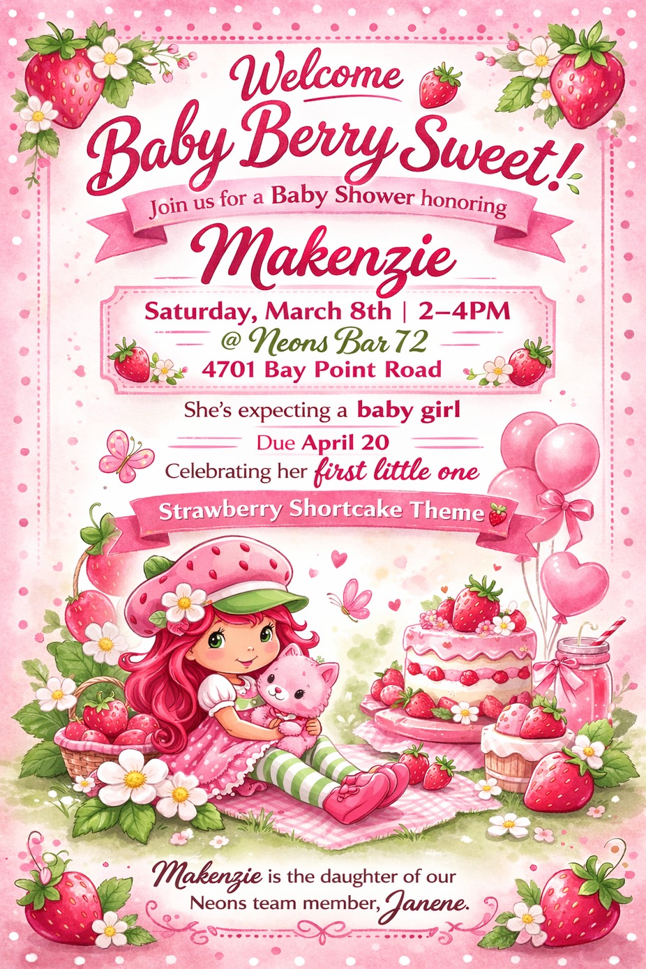 Baby's room is Strawberry Shortcake-themed; red, white, pink. Registry: target.com/gift-registry/gift/makenzie-52