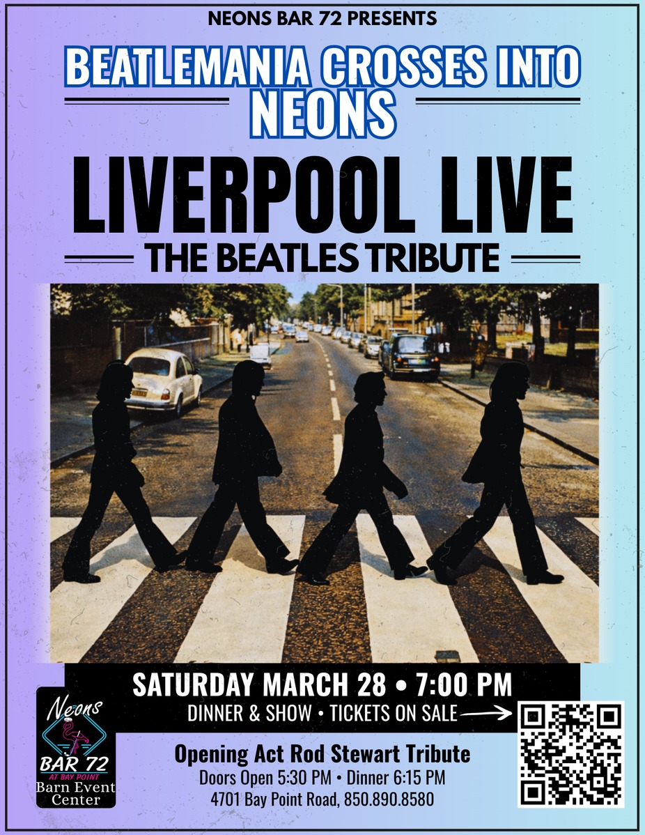 Join us at Neon’s Bar 72 for an unforgettable night with Liverpool Live, one of the nation’s premier Beatles tribute bands. This high-energy concert experience brings the sound, style, and spirit of the Fab Four to life — from the early Ed Sullivan days to the iconic hits that defined a generation.